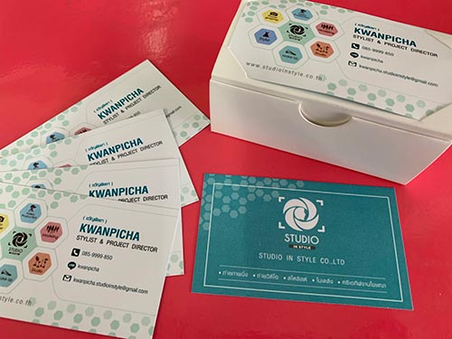 ผลงานนี้ก็เช่นกันเป็นนามบัตรที่แสดงถึงความเป็นลักษณะเฉพาะองค์กรของลูกค้าได้เป็นอย่างดี เน้นโทนสีสว่าง ทำให้ผู้อ่านอ่านได้ชัดเจน รูปแบบและโทนสีเช่นนี้จึงเหมาในการใช้เป็นนามบัตรออแกไนซ์ นามบัตรบริการถ่ายภาพ ถ่ายวีดีโอ เป็นต้น